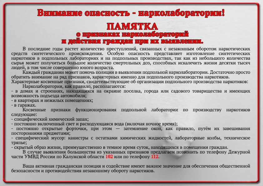 - ПАМЯТКА о признаках нарколабораторий и действий граждан при их выявлении