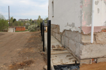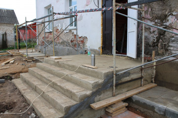 Сейчас идут подготовка основания для устройства полов и расчистка штукатурки на фасаде. Сегодня начнется укладка брусчатки.