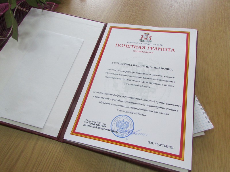 За многолетний добросовестный труд, высокий профессионализм в исполнении служебных обязанностей, достигнутые успехи в обучении и воспитании поколения Почетной грамотой Смоленской областной Думы была отмечена заместитель директора МБОУ Булгаковская ООШ Булыжкина Валентина Ивановна.