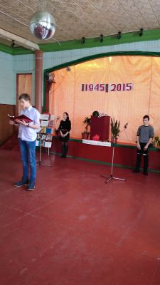 В начале программы выступила Фоменкова А. Н.. Она рассказала о работе Духовщинского поискового отряда "Комбат" под руководством Чернышова Александра Анатольевича, прочитала свои стихи, призвала всех быть патриотами своей Родины и беречь мир.