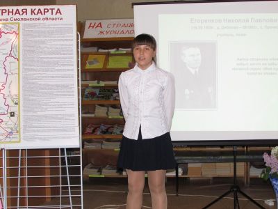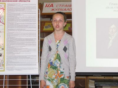 С.М. Журавская, руководитель музея Духовщинской СОШ им. П.К. Козлова, рассказала о духовщинских поэтах и писателях, учившихся в Духовщинской школе.