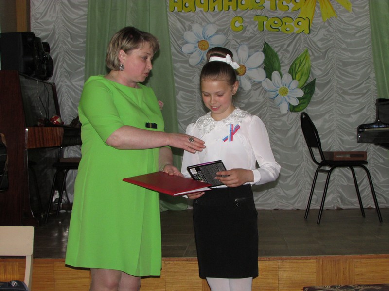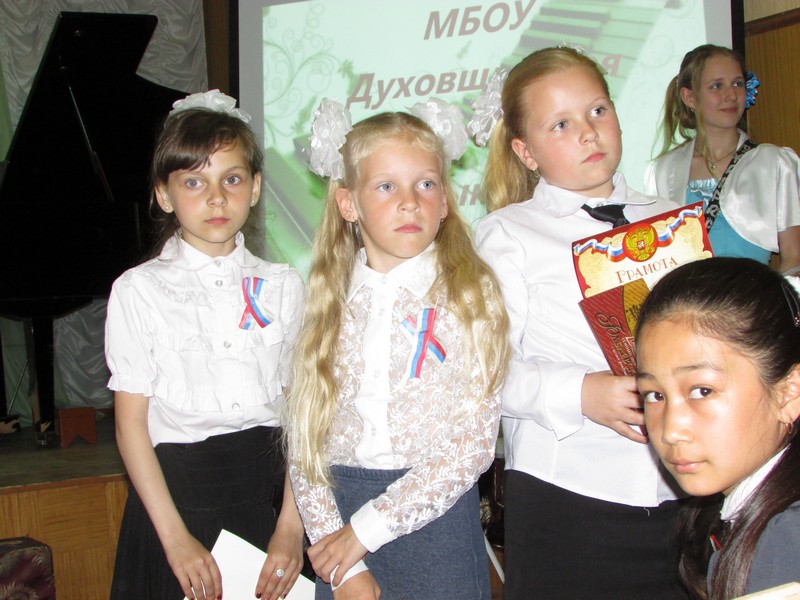Директор МБОУ Духовщинская детская музыкальная школа Е.М. Новикова, поздравив ребят с успешным окончанием учебного года, вручив похвальные грамоты отличникам, особо отметила учеников, которые в этом учебном году добились заметных успехов и которым на концерте были вручены почётные грамоты.