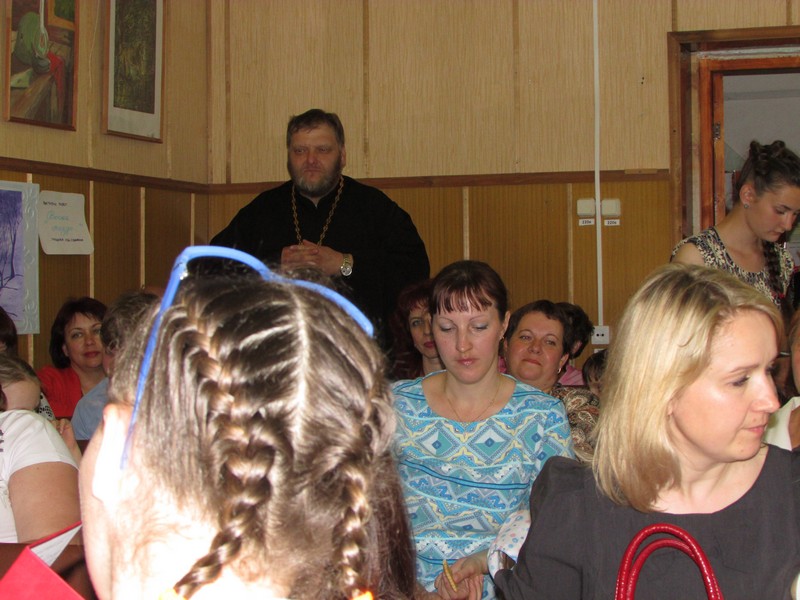 Слова приветствия для учителей и учеников школы произнесли и настоятель Духовщинского храма отец Олег, и и.о директора Духовщинского историко-художественного музея Н.А. Бабкова, и глава муниципального образования Духовщинского городского поселения В.К. Терентьев.