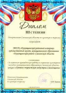 Духовщинский историко-художественный музей награждён Дипломом III степени в номинации "За активную краеведческую работу и сохранение культурного наследия муниципального образования Смоленской области".