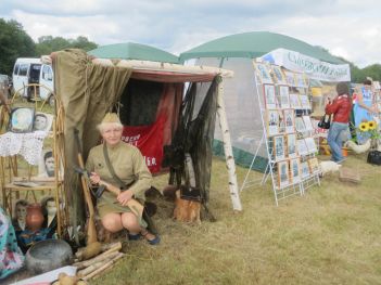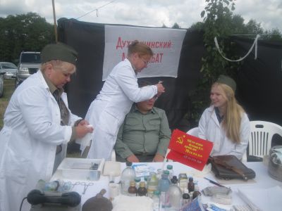 Вместе с выступлениями творческих коллективов районы представили и военные подворья с рассказами о трагической судьбе родных мест во время Великой Отечественной войны. Духовщинский медсанбат рассказал о роли военных врачей и медсестер на полях сражений, в игровой форме для детей продемонстрировал оказание помощи «раненым бойцам».