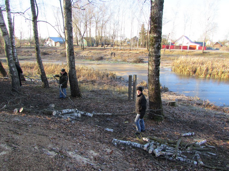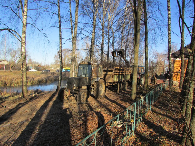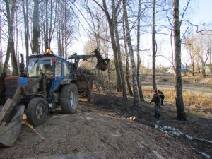 Участники субботника расчистили берег озера от различного мусора, хлама, копившегося здесь годами, убрали выпиленные вокруг озера деревья, сгребли листву возле памятника освободителям Духовщинской земли от немецко-фашистских захватчиков, погрузили на трактор.