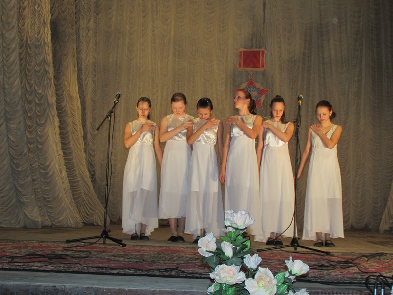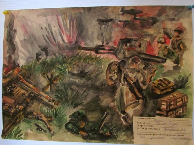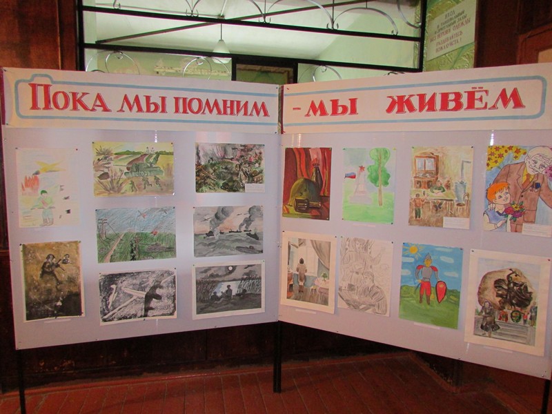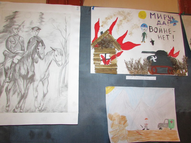 В фойе Дома культуры была организована выставка детских рисунков, посвящённых теме войны.