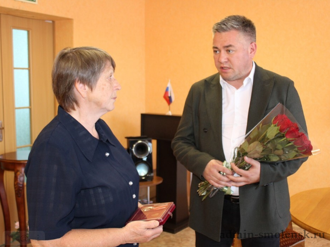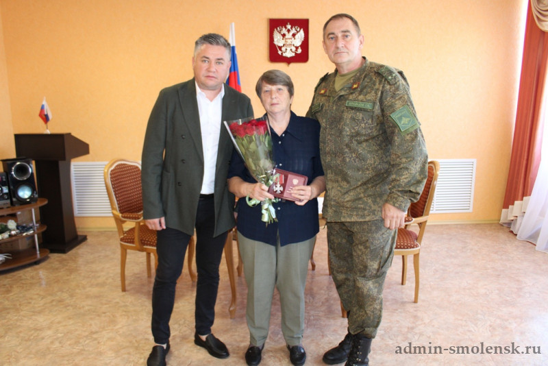 Сегодня награду Наталье Сидоровне передали специалист-эксперт военного комиссариата города Ярцево, Духовщинского, Кардымовского и Ярцевского районов, подполковник Григорий Кравцов и глава округа Виктор Молотков.