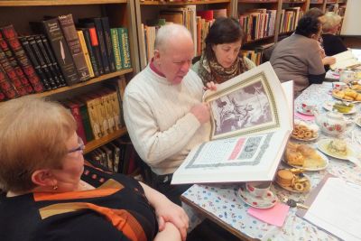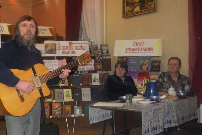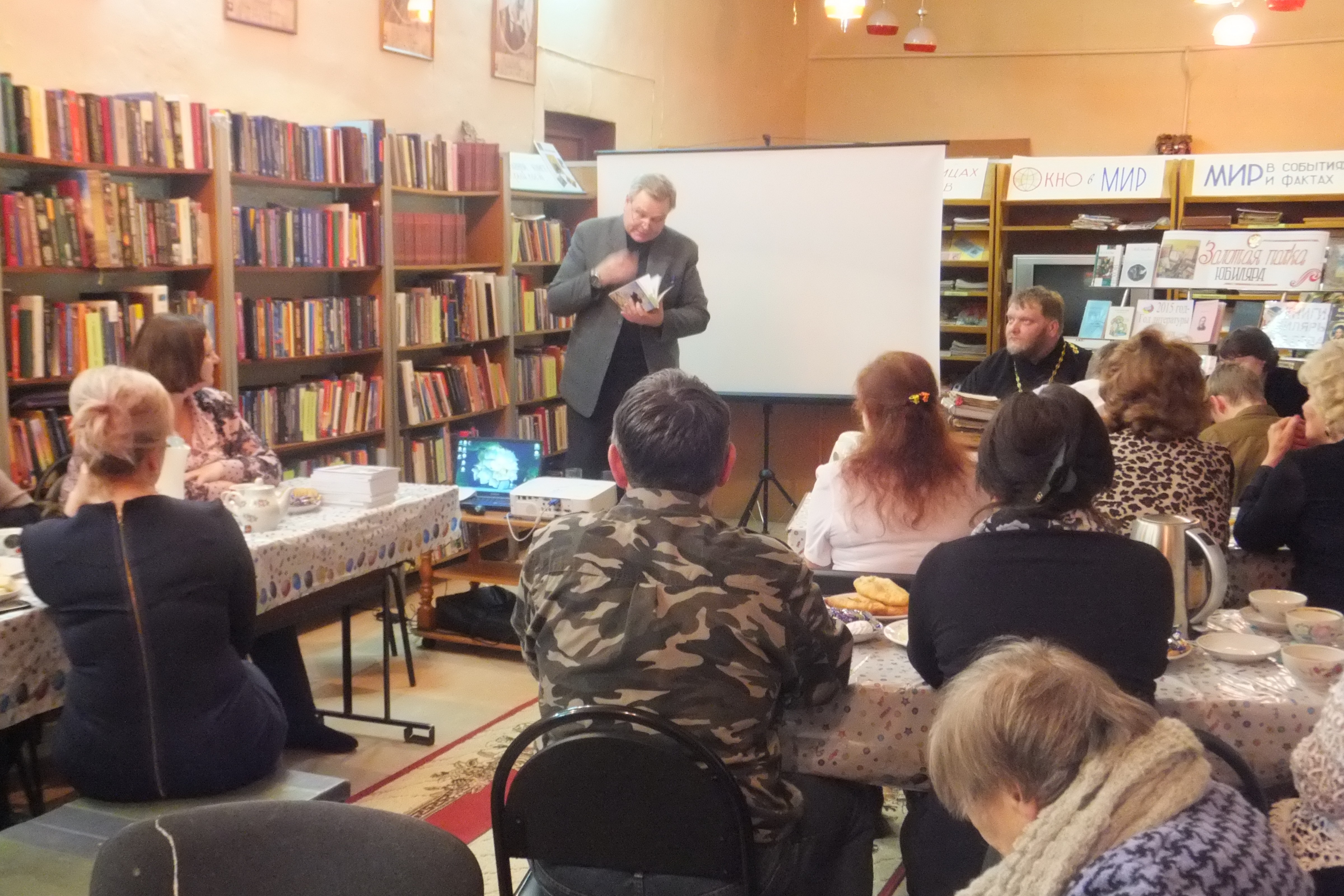 Литературный вояж в историю книги совершил протоиерей Свято-Духовского Храма Олег Козловский. Он принес на вечер старинные православные книги, рассказал о них, а также о значении письменности на Руси и о возникновении книгопечатания.