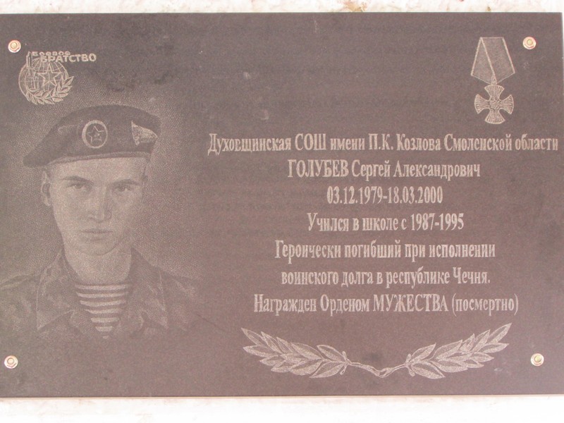 18 сентября 2015 года в Духовщине по инициативе Смоленского областного отделения Всероссийской организации «Боевое Братство» состоялось открытие мемориальной доски духовщинцу воину-интернационалисту Сергею Голубеву. Посмертно 20-летний Сергей Голубев был награжден орденом Мужества.