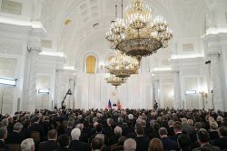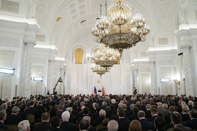 На мероприятии, состоявшемся в Георгиевском зале Большого Кремлевского дворца, присутствовали члены Совета Федерации, депутаты Государственной Думы, члены Правительства, руководители Конституционного, Верховного и Высшего Арбитражного судов, губернаторский корпус, председатели законодательных собраний регионов, главы традиционных конфессий, общественные деятели, руководители крупнейших СМИ.
