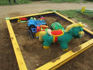 Внимание малышей сразу привлекает весёлая песочница, расположенная в центре игрового комплекса.