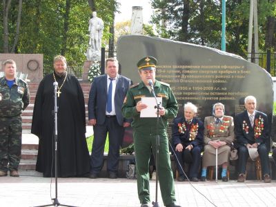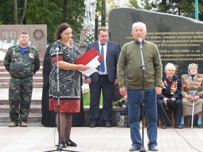 2015 год – это год 70-летия Великой Победы. В рамках этого знаменательного события 18 сентября на здании Духовщинской школы была открыта мемориальная доска в честь нашего земляка Голубева Сергея, который погиб в Чечне, защищая целостность Российской Федерации. «Самое главное, чтобы молодое поколение чтило память всех героев, отдавших жизни за светлое будущее, за светлую жизнь нашей Родины, - также к молодому поколению обратилась заместитель главы района Н.С. Образцова-Чепой.
