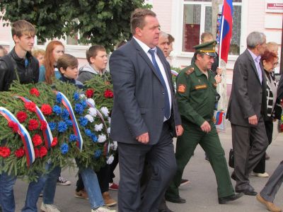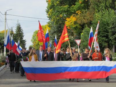 Жители и гости города пришли в этот день, чтобы отдать дань уважения тем, кто одержал победу над фашистскими захватчиками. Праздничная колонна, в шествии которой приняли участие представители всех организаций и учреждений города, школьники, прошла по улице Советской районного центра. Шествие украсили российские триколоры, праздничные флажки, цветы.