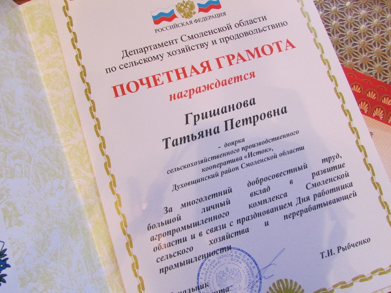 За многолетний добросовестный труд, большой личный вклад в развитие агропромышленного комплекса Смоленской области и в связи с празднованием Дня работника сельского хозяйства и перерабатывающей промышленности Почётными грамотами Департамента Смоленской области по сельскому хозяйству и продовольствию наградили доярку СПК «Исток» Гришанову Татьяну Петровну.