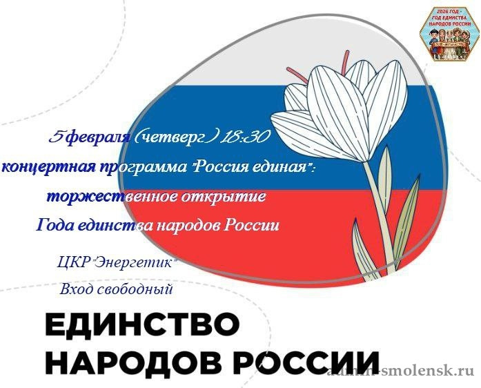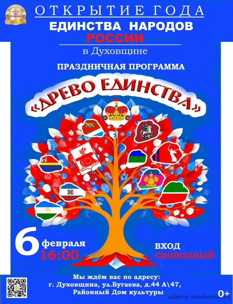 2026 год президент России Владимир Путин объявил Годом единства народов России. 6 февраля приглашаем жителей и гостей города Духовщины на праздничную программу, посвященную открытию Года единства народов России "Древо единства"