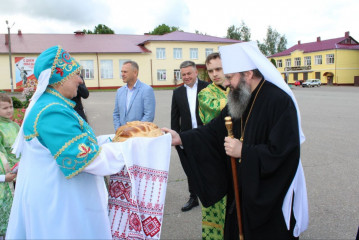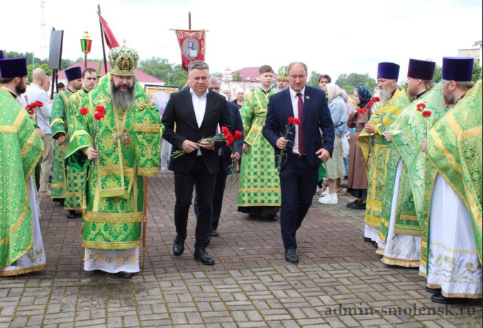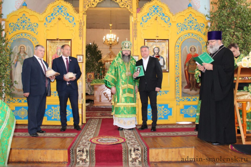 По окончании божественной литургии митрополит поздравил всех присутствующих с праздником. К поздравлениям присоединились глава Духовщинского округа Виктор Молотков, а также депутаты областной Думы Николай Дементьев и Алексей Василенков.
