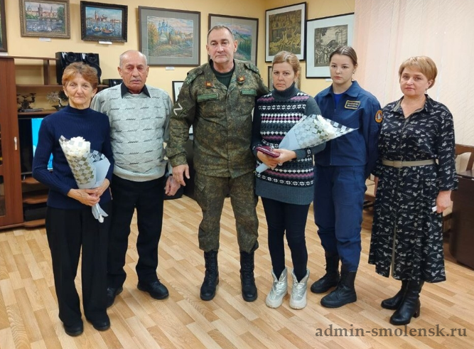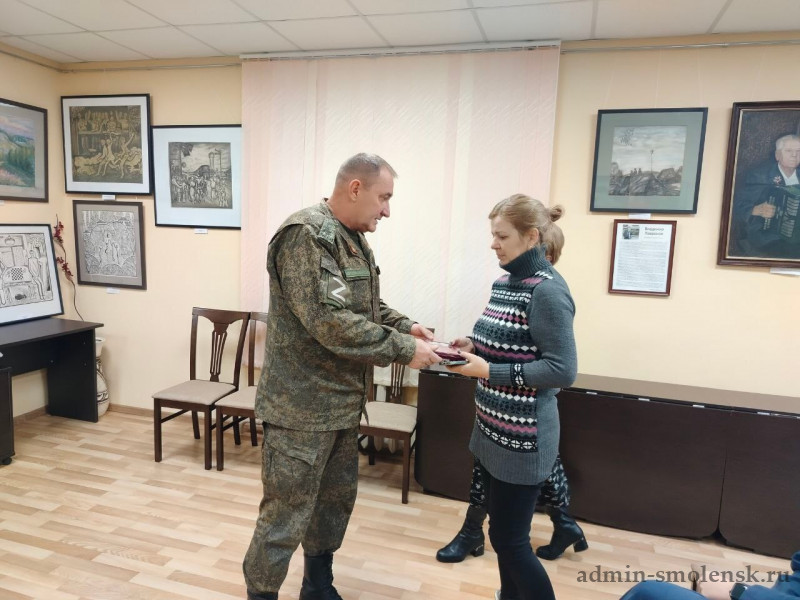 Житель города Духовщины Роман Александрович Семенков геройски погиб 30 марта 2025 года в ходе выполнения боевого задания у населенного пункта Каховка Херсонской области. Сегодня награду его семье передали специалист-эксперт военного комиссариата города Ярцево, Духовщинского, Кардымовского и Ярцевского районов, подполковник Григорий Кравцов и Ио заместителя главы округа Елена Новикова.