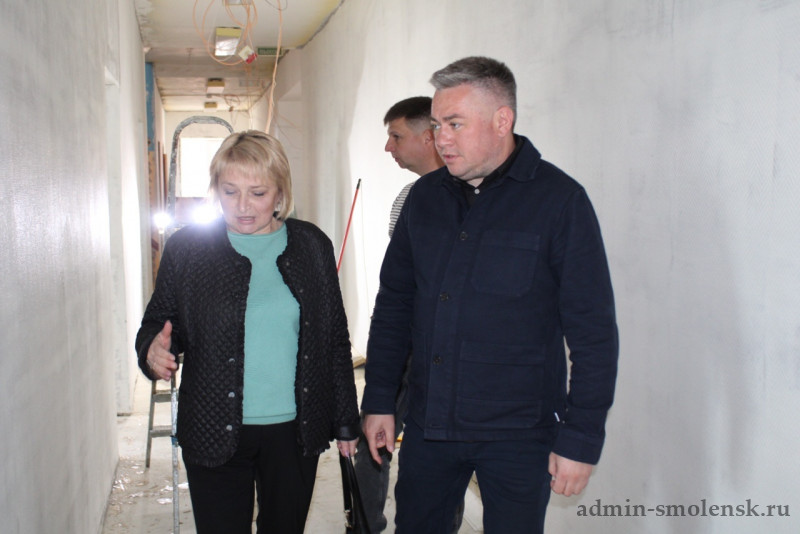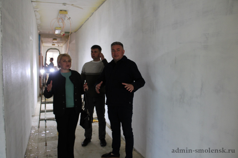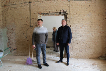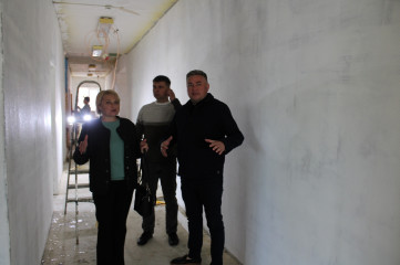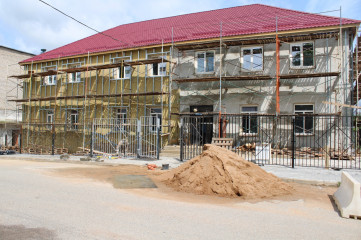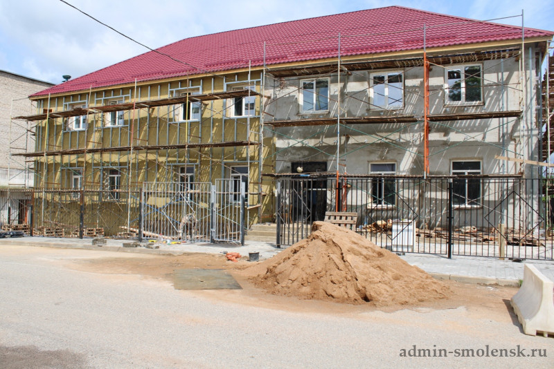 В помещениях проводятся работы по обновлению стен, полов и потолков. На первом этаже начались отделочные работы. Одновременно с этим идет благоустройство территории и подготовка фасада для будущей облицовки металлокассетами.