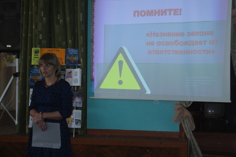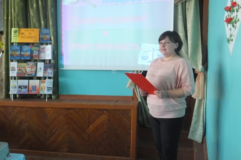 Зав. отделом обслуживания ЦБС Ходотова Ю.В. в ходе слайд-презентации рассказала учащимся, что такое правонарушение, о видах правонарушений и об ответственности, которую несут подростки при правонарушениях.