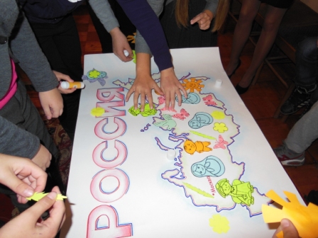 В заключение урока на шаблон карты России ребята приклеили картинки, символизирующие добро, мир и хорошее настроение.