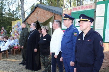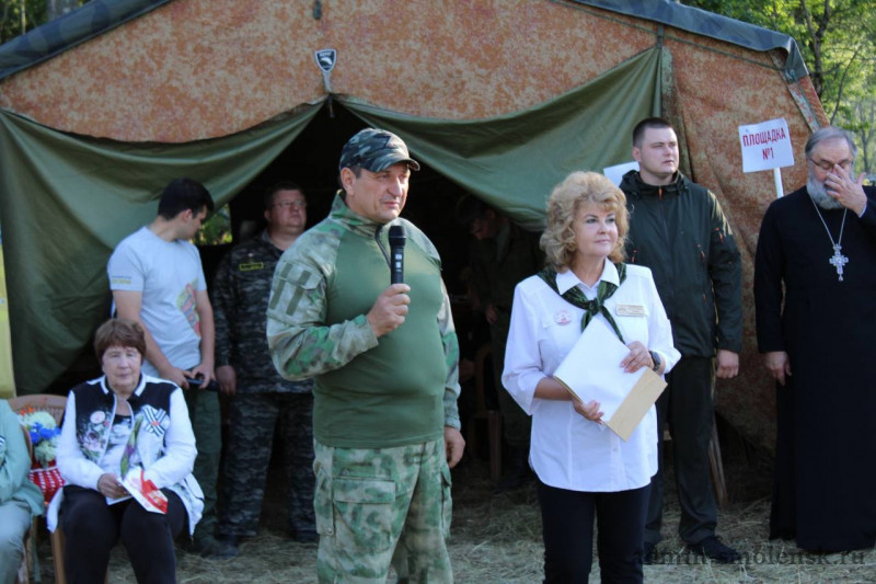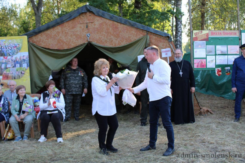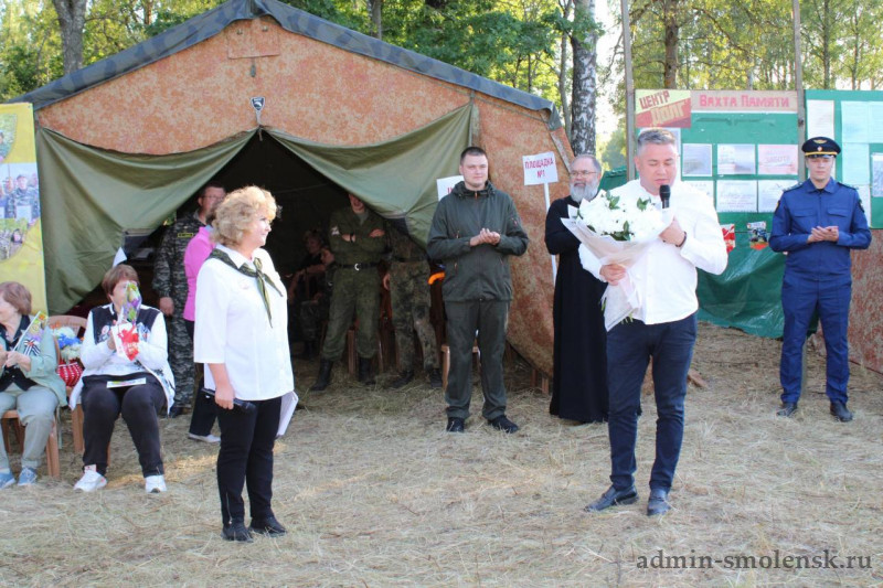 Вместе с председателем Смоленской областной Думы Игорем Ляховым, прокурором Духовщинского района Антоном Плющевым, депутатами облдумы, благочинным Ярцевского благочиннического округа отцом Василием поисковиков приветствовал глава округа Виктор Молотков. Он поблагодарил всех участников Вахты за их такой нужный и важный труд. Отдельные слова признательности он высказал руководителю смоленского поискового движения Нине Германовне Куликовских: "Именно под чутким руководством Нины Германовны все больше людей узнает о нашей великой истории. И те знания, которые они получают на местах героических сражений, будут передаваться дальше — из поколения в поколение".