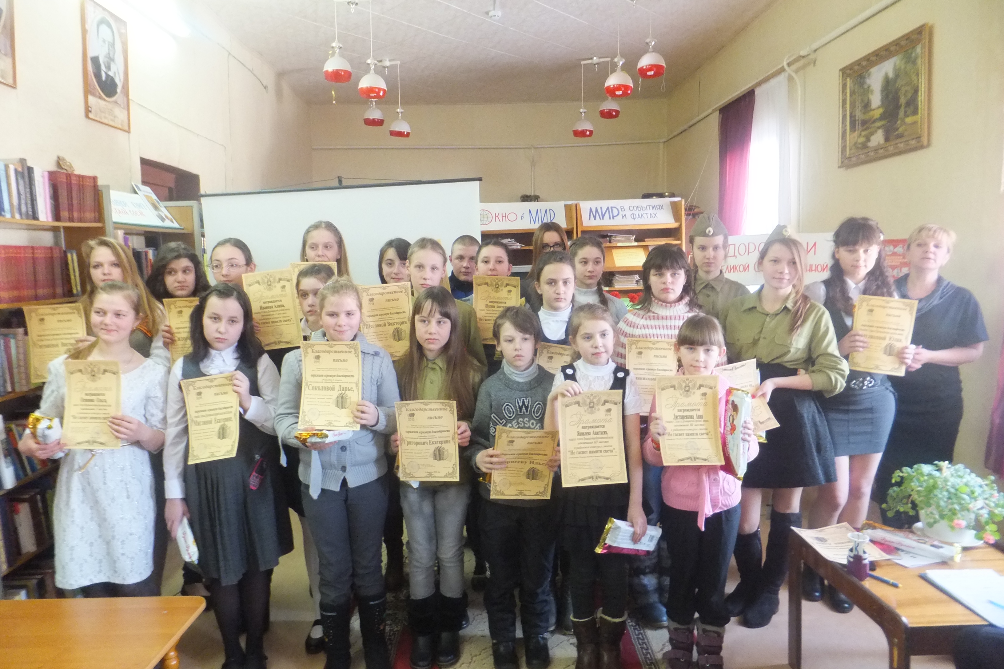 3 место заняли: Козлова Мария - учащаяся 10 класса Озерненской средней школы (Озерненская городская библиотека), Слепенкова Алина - учащаяся 10 класса Озерненской средней школы (Озерненская городская библиотека), Блинова Карина - учащаяся 10 класса Духовщинской средней школы (Центральная районная библиотека), Шитова Дарья - учащаяся 9 класса Духовщинской средней школы (Центральная районная библиотека), Листошенкова Анна - учащаяся 2 класса Духовщинской средней школы (Ерышовская сельская библиотека), Яковлева Анастасия - учащаяся 4 класса Троицкой школы (Троицкая сельская библиотека).