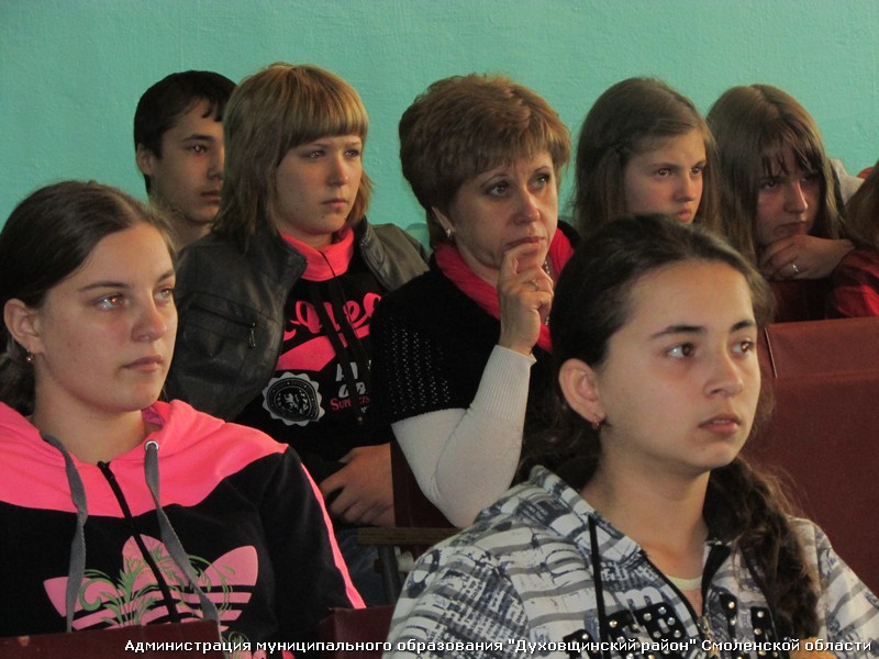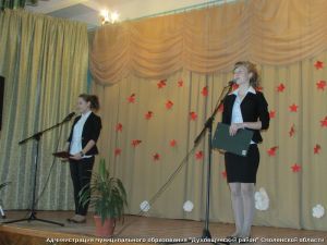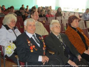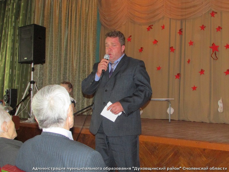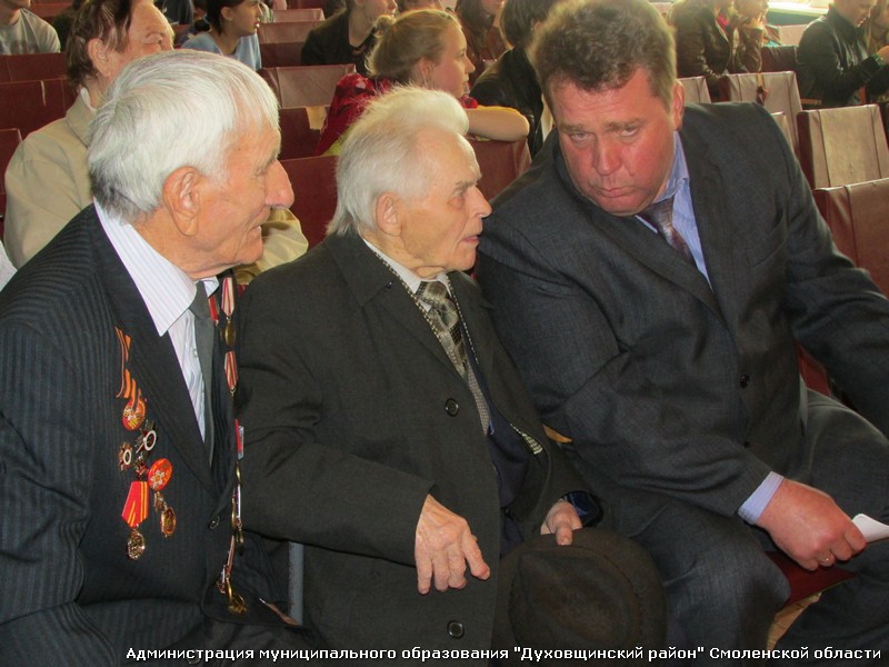 Б.В. Петифоров, Глава Администрации муниципального образования «Духовщинский район», приветствовал собравшихся в актовом зале школы, выразил слова огромной благодарности всем духовщинцам, воевавшим в годы Великой Отечественной войны. Особые слова были высказаны в адрес пришедших на встречу ветеранов Васильева Василия Павловича и Куликова Алексея Антоновича.