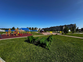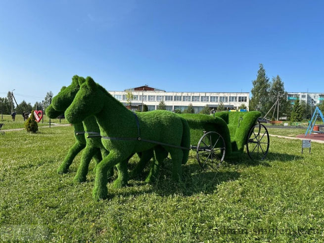 В этом году в поселке продолжили работы по благоустройству парка. Сначала здесь обустроили еще одну детскую площадку, затем приобрели декоративные арт-объекты в виде тройки лошадей с каретой.