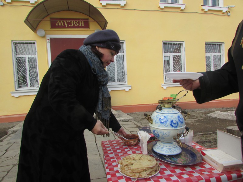 Сотрудники Духовщинского историко-художественного музея радушно угощали всех желающих масленичными блинами, горячим чаем из русского самовара и ароматным вареньем.