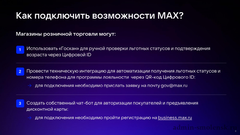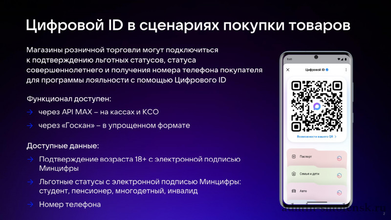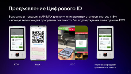 - Подтверждение льготных статусов и статуса совершеннолетнего в сценариях покупки товаров и подключение программы лояльности